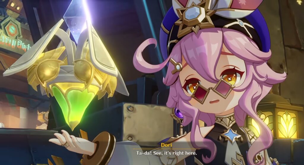 Dori shows the Traveller a Device that her “supplier” made for her. In that conversation, we learn that Kaveh had been asked to create the device after Nahida asked him for it. In true Kaveh fashion, he created multiple designs of the Device and stressed over it for a while.