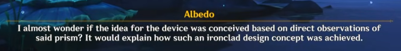 In Act 8 of the Nod-Krai Archon quest, Albedo marvels over the design of the device, thinking it was Nahida that created it, when it was in fact, Kaveh.