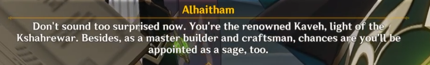 During the exchange, Alhaitham compliments Kaveh. It sounds sarcastic, but after learning more about Alhaitham in his character stories, this might have been a genuine compliment by Alhaitham that Kaveh misunderstood.